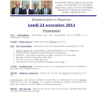 Le député du Nord-Mayenne a assisté, vendredi 18 novembre, au conseil d'administration du festival de théâtre amateur Les Poquelinades (photo 1). La deuxième édition de ce rendez-vous théâtral dans le Nord-Mayenne aura lieu les 28 et 29 avril 2012, au théâtre de Mayenne.